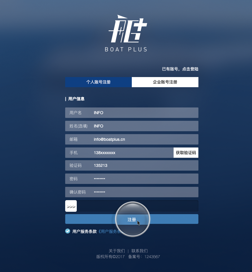 輸入所需要的用戶名、姓名(選填)、郵箱、手機、驗證碼、密碼等信息,點擊注冊即可注冊個人用戶賬號。