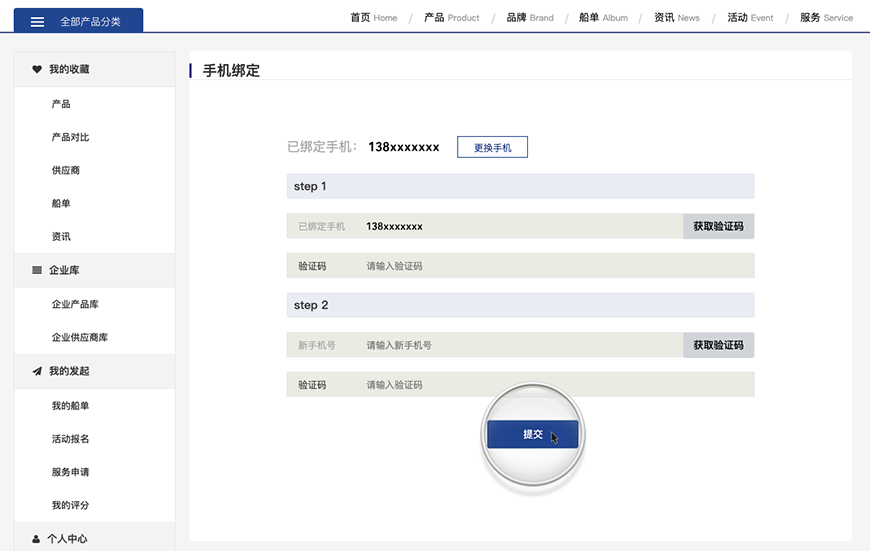 手機驗證主要包括當前已經綁定的手機號。點擊更換手機會先驗證之前的手機號碼,然后再添加自己更改之后的新手機號。兩個密碼都需要獲取驗證碼去驗證。