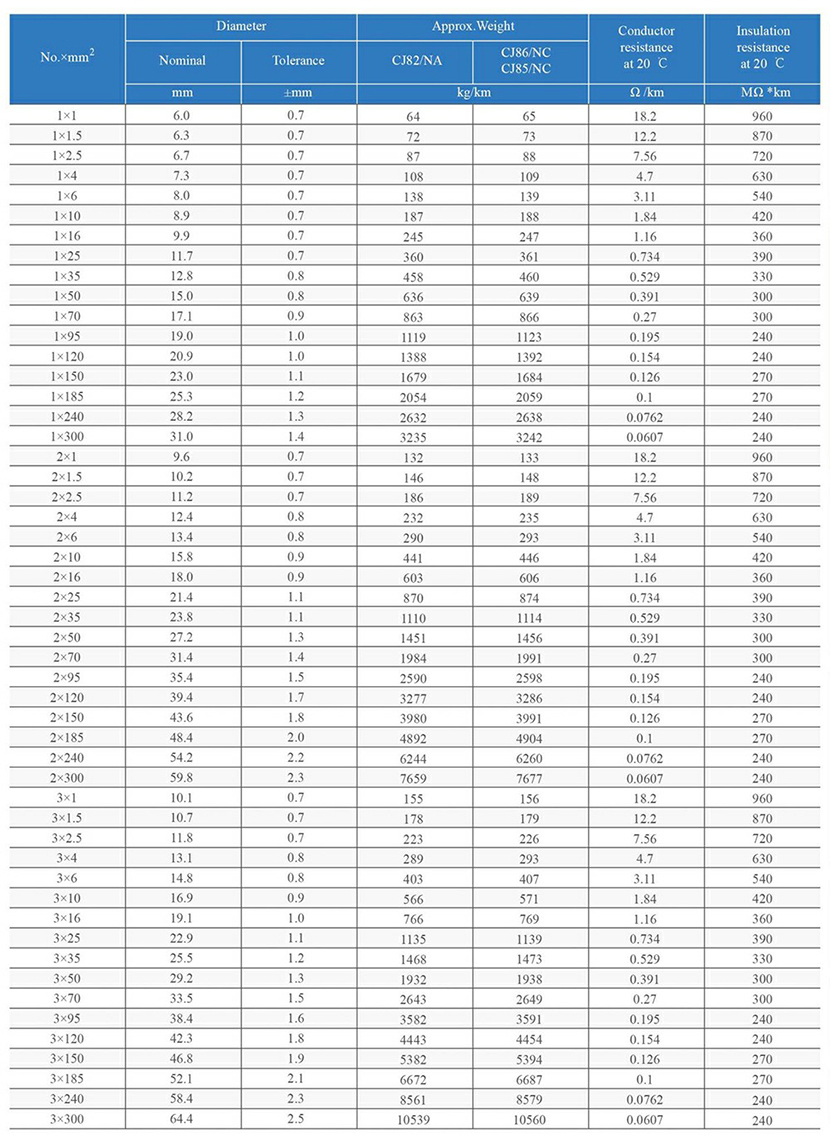 20℃時的導體電阻: 7.56Ω/km 20℃時的絕緣電阻: 720MΩ×km