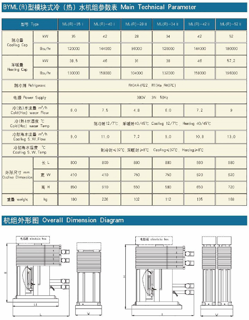 冷(熱)水溫度: 制冷時12/7℃,采暖時40/45℃ 冷卻海水流量: 3.6m3/h