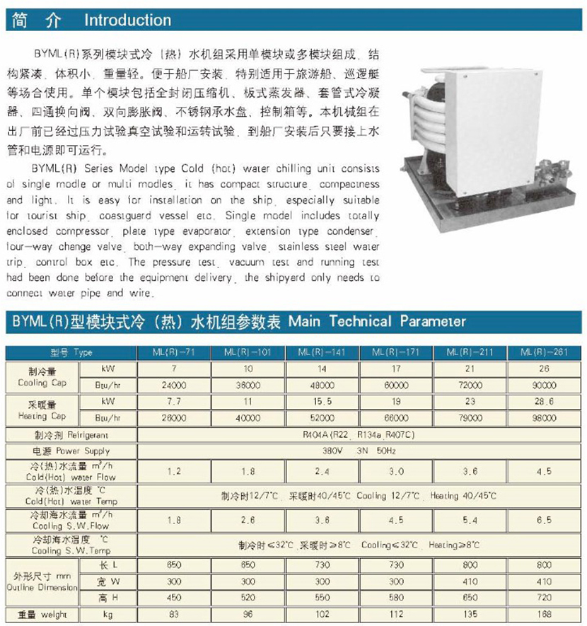 冷(熱)水溫度: 制冷時12/7℃,采暖時40/45℃ 冷卻海水流量: 9.0m3/h