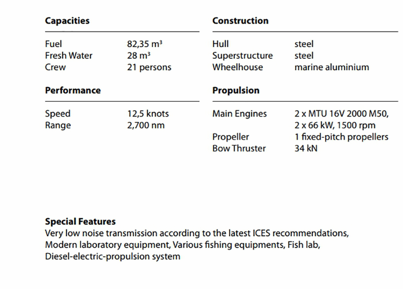 燃油容量: 82.35m3 發動機功率: 2 x 66 kW at 1500rpm