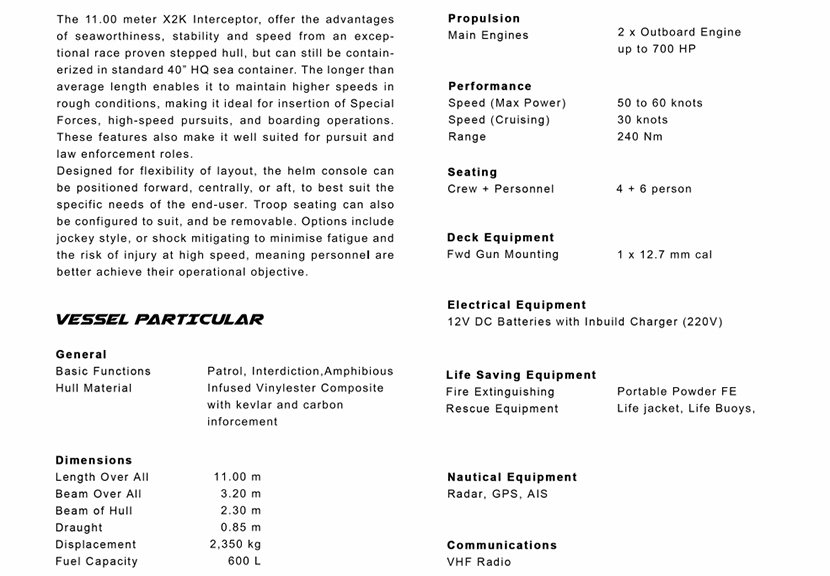 | 最大航速: | 50-60kn | 型寬: | 3.20m |