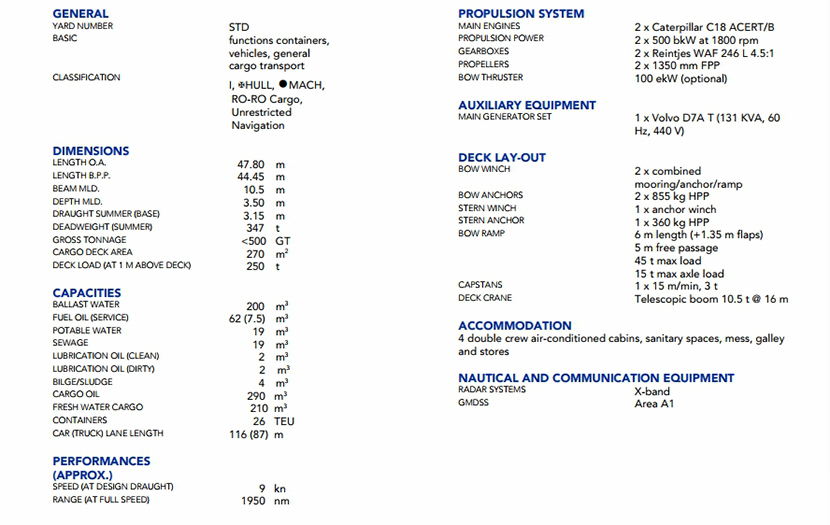 發動機功率: 2×500bkW at 1800rpm 推進裝置: 2×1350mmFPP