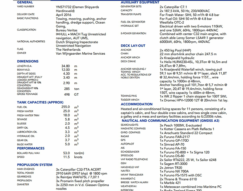 發動機功率: 2910bkW at 1800rpm 推進裝置: 3×Promarin fixed pitch propellers