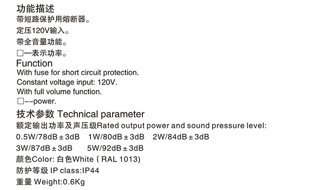 | 功率: | 1W | 聲壓等級: | 80dB |