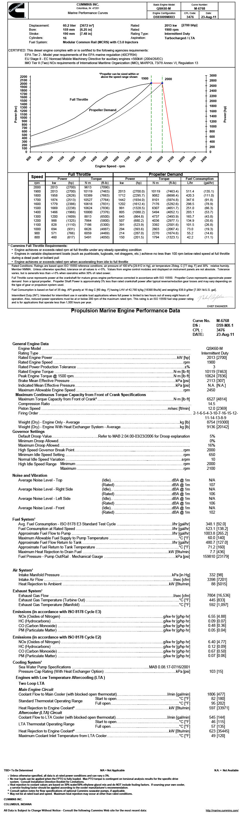 進氣方式: Turbocharged/LTA 最大扭矩: 10624N.M(轉速為1500rpm下的最大扭矩)