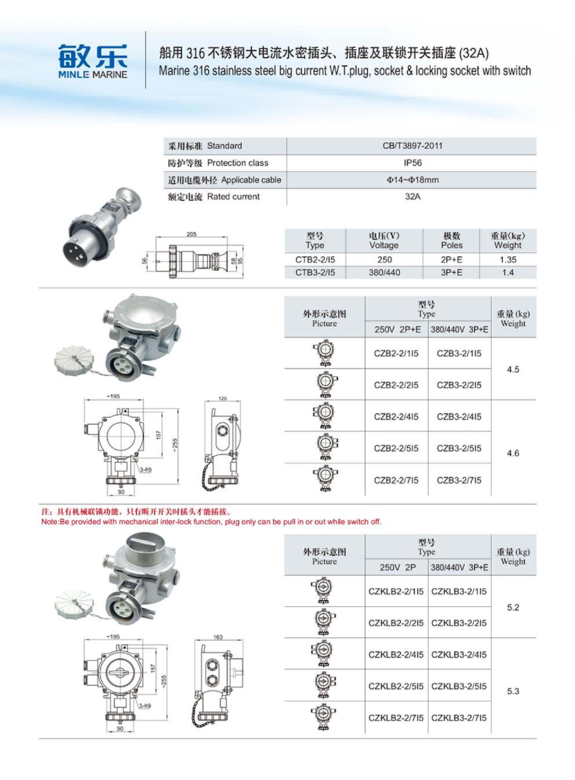 | 船用316不銹鋼大電流水密聯(lián)鎖開關插座(32A) | |||