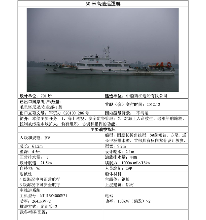 | 排水量: | 440t(滿載) | 發動機品牌: | MTU16V4000M71 |