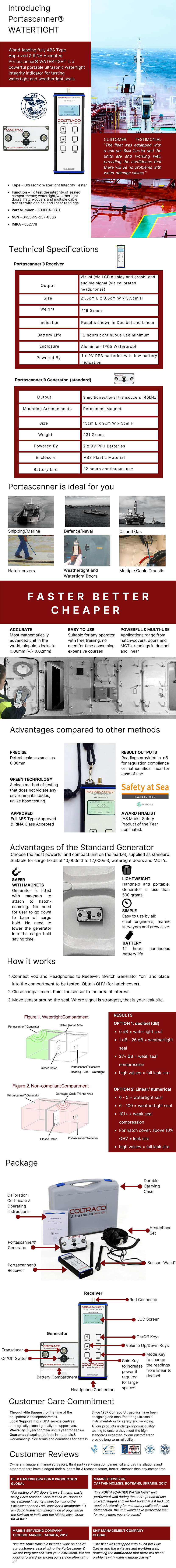 性能亮點: Quick but accurate;Easy to use and get the leak level; No necessary to go down to the base of cargo hold;A clean method different from hose testing 合作伙伴: EverSailing Marine Safety Technologies / RMS Marine Service / Shanghai Eastone Marine Technologies