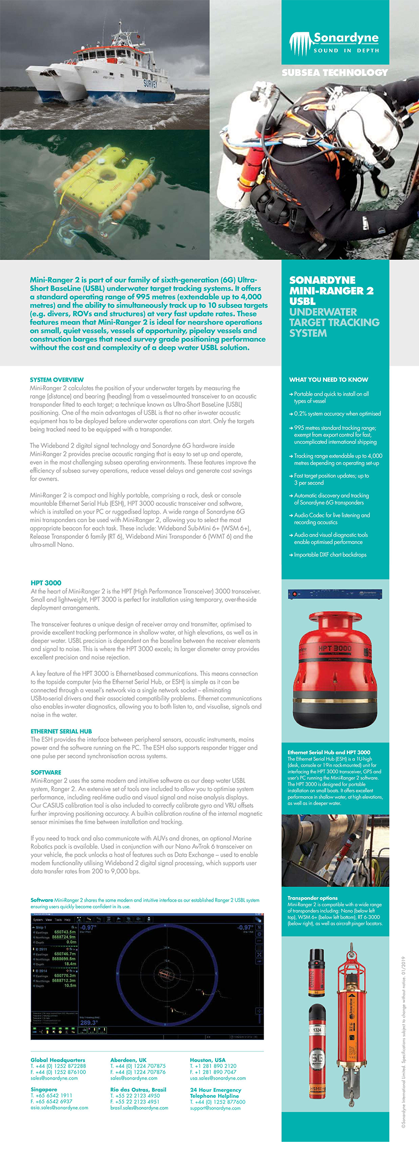 | 性能亮點: | Portable and quickly to install and mobilize;Reliable performance both in shallow and deep environment; Automatic discovery and tracking; Accuracy without the affect of depth; Without the cost and complexity of a deep water USBL solution; Reduce vessel delays; Cost saving for owners | 售后政策: | 1 year return to Sonardyne service centre; expert advice; operator trainning; email helpline and 24 hour worldwide telephone help-line+AA12;annual service visit |