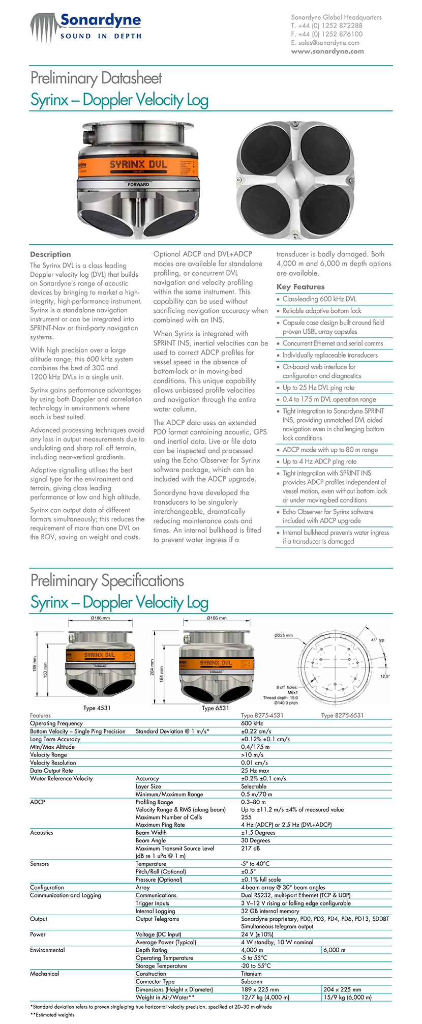 環境溫度: -5 to +55°C (operating); -20 to +55°C (storage) 性能亮點: Can work at an altitude higher than 85% of the world’s subsea infrastructure; The adaptive bottom lock technology inside Syrinx provides consistency and reliability over challenging and changing topography; Individually replaceable transducers