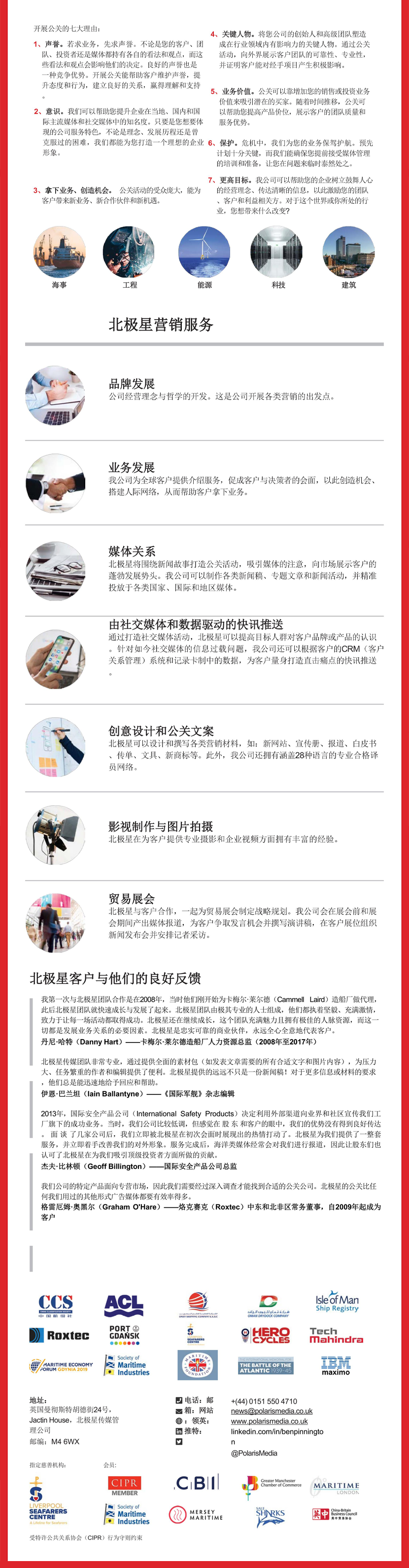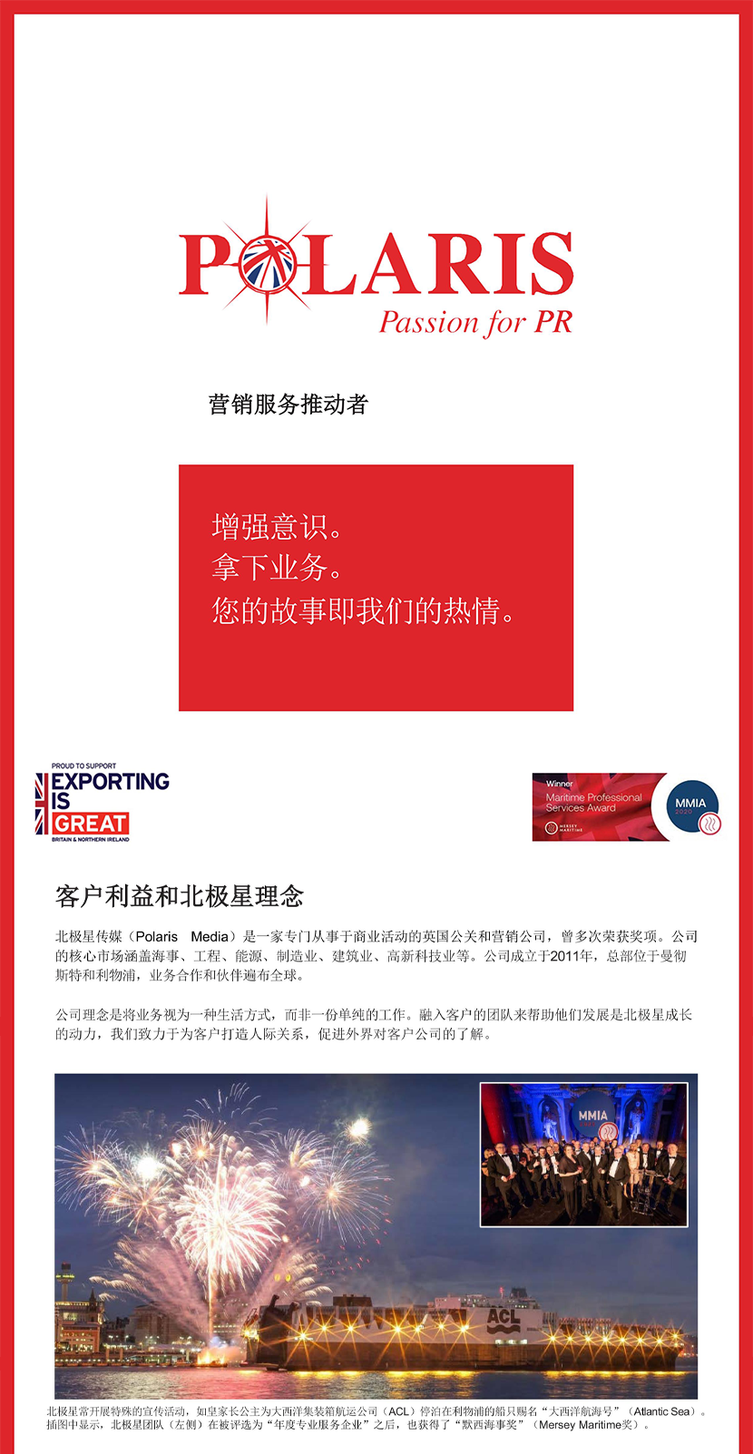 | 專業(yè)優(yōu)勢: | 對航運業(yè)公關課題研究多年;從事商業(yè)公關及營銷活動經驗豐富;完善的公關體系;業(yè)務鏈條完整;豐富的人脈資源;公關效率可觀;榮獲“年度專業(yè)服務企業(yè)”及“默西海事獎” | 合作伙伴: | CCS; ACL; Roxtec; Port Gdansk; Oman; Isle of Man Ship Registry; Seafarers Center; Maritime Economy Forum Gdynia; Maritime Foundation; Society of Maritime Industries |