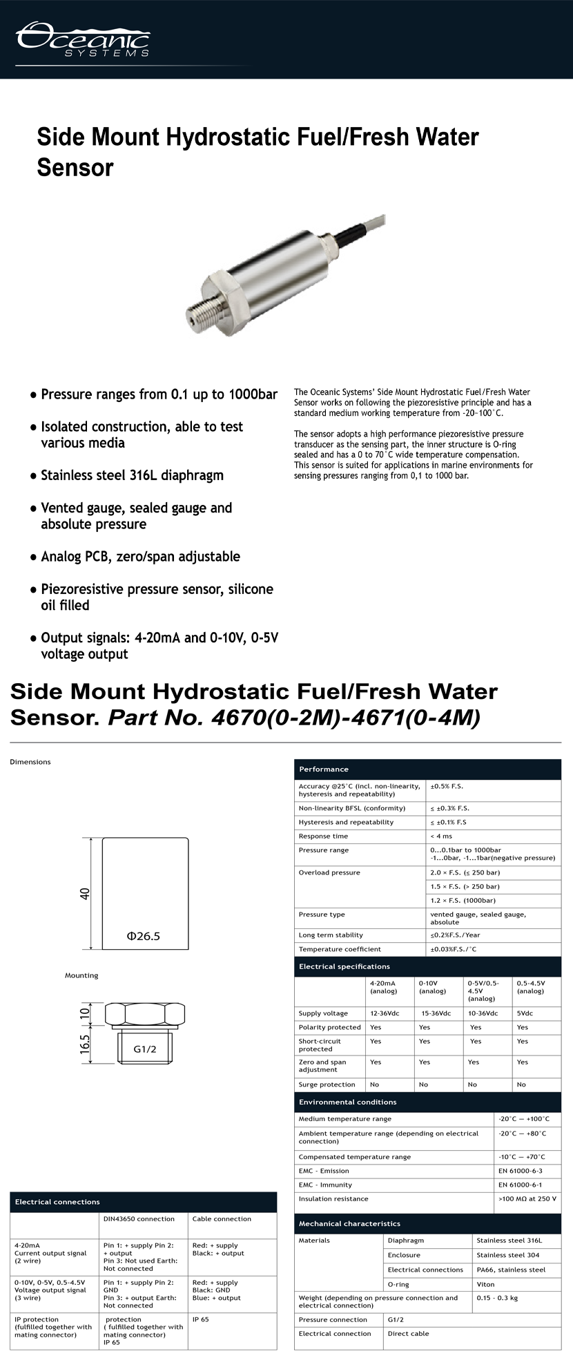 性能亮點: 可測量不同媒介;內部環形密封結構具備0-70度溫度補償 輸出信號: 4-20mA (analog);0-10V (analog);0-5V/0.5-4.5V (analog);0.5-4.5V (analog)