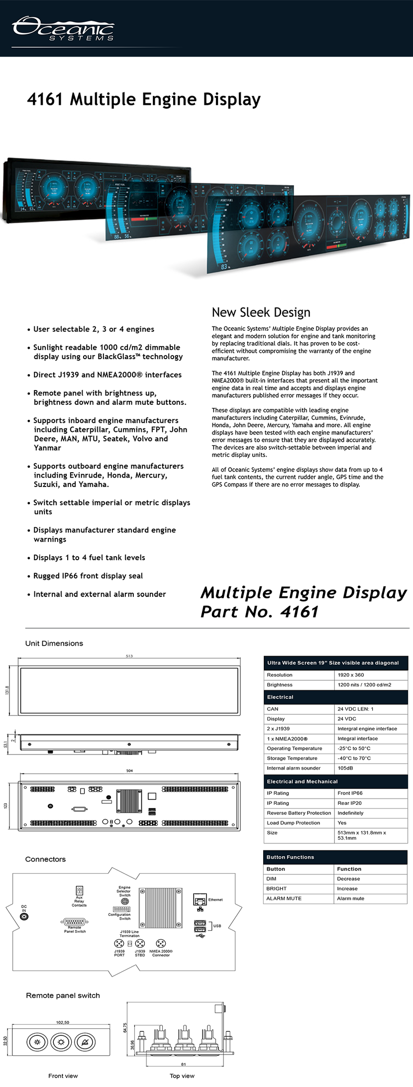 | 適配發(fā)動機品牌: | 舷內機- Caterpillar, Cummins, FPT, John Deere, MAN, MTU, Seatek, Volvo, Yanmar;舷外機- Evinrude, Honda, Mercury, Suzuki, Yamaha | 防護等級: | IP66(Front)/ IP20(Rear) |