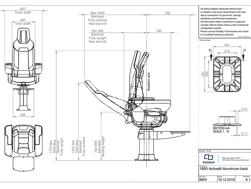 1800系列氣彈簧式重力調節鋁合金椅背座椅