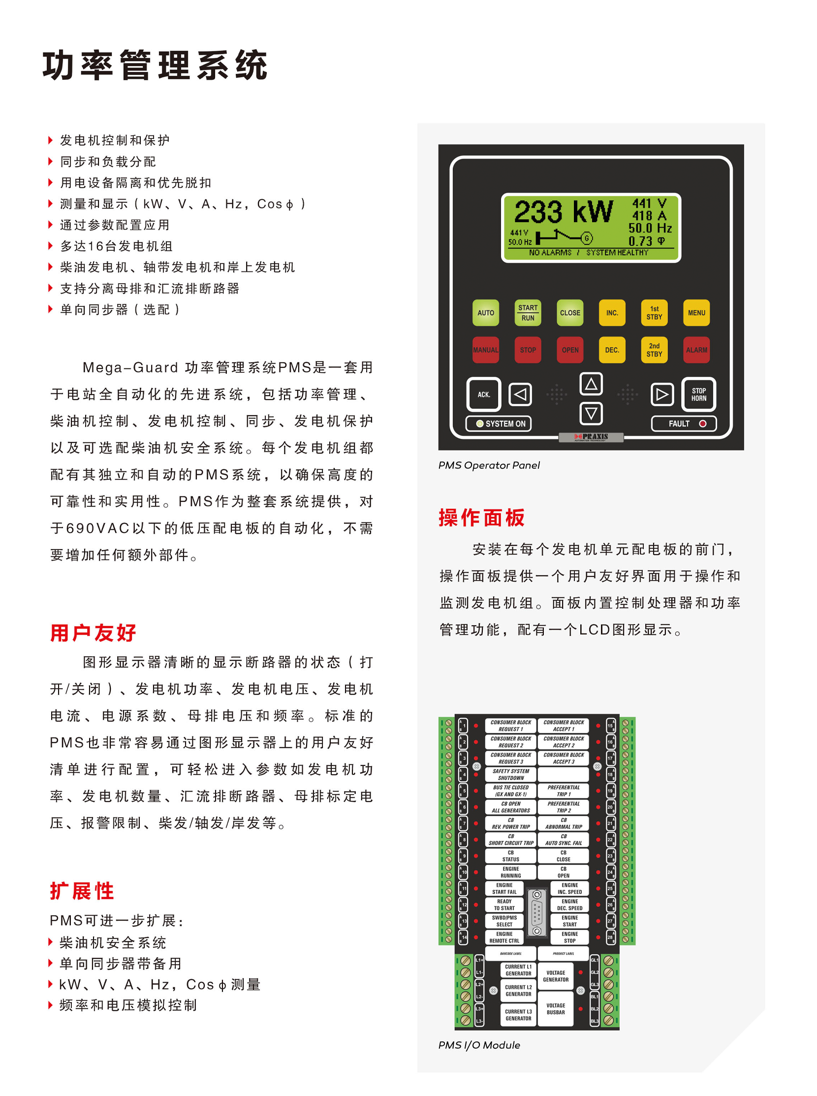 | 系統(tǒng)特點: | 用于電站全自動化; 每個發(fā)電機組都 配有其獨立和自動的PMS系統(tǒng);對于690VAC以下的低壓配電板的自動化管理,不需要增加任何額外部件;圖形界面直觀、易配置;PMS可進一步擴展更多功能 | ||