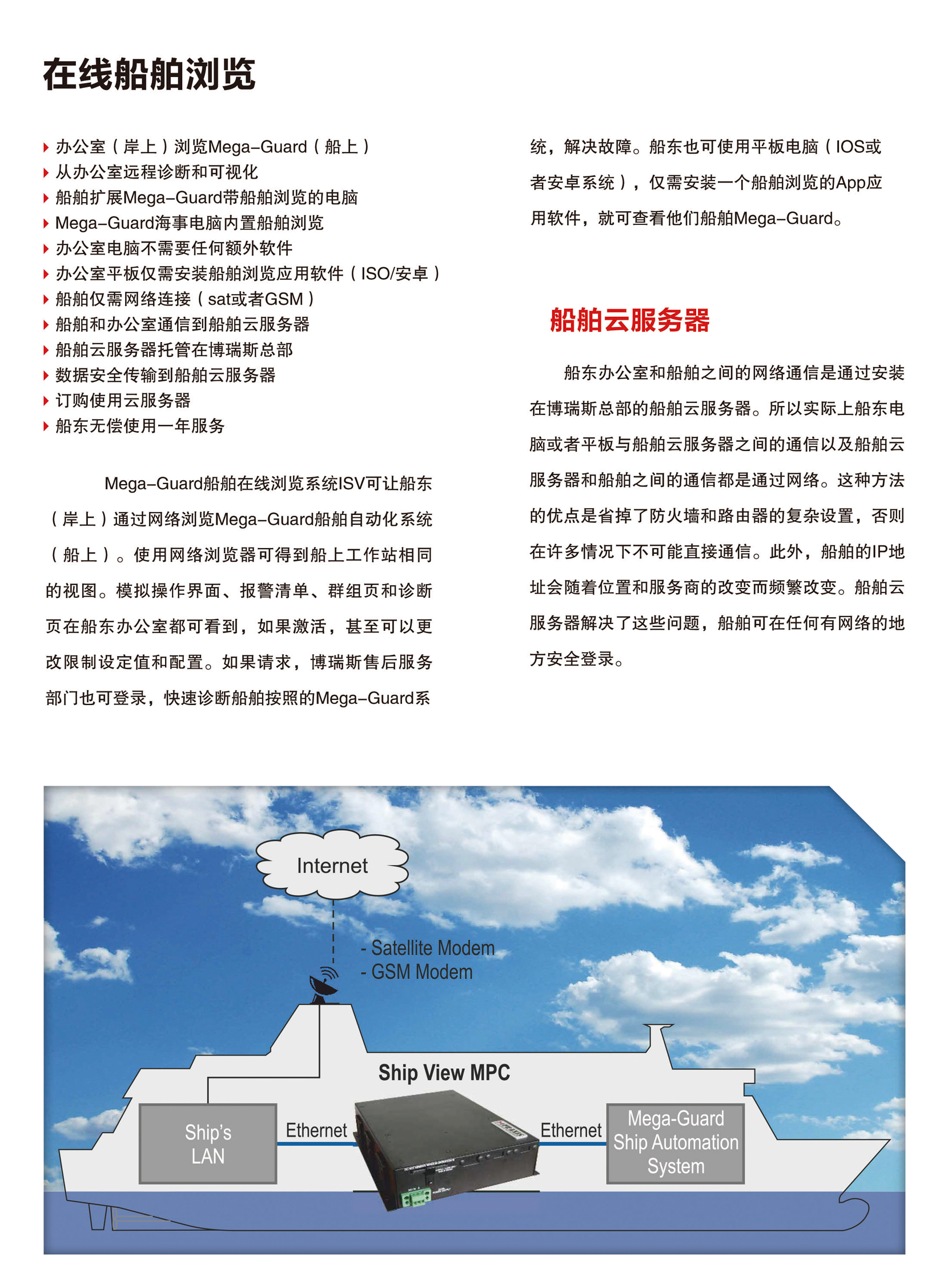| 系統特點: | 可從岸上瀏覽船上的Mega-Guard 系統 ,實現遠程診斷和可視化,可得到與船上工作站相同的視圖;電腦不需要任何額外軟件,平板電腦(10S或 者安卓系統)僅需安裝一個船舶瀏覽的App應用軟件,就可查看他們船舶Mega-Guard;在保證數據安全的情況下,可自動省去防火墻和路由器的復雜設置,船舶可在任何有網絡的地方安全登錄該軟件;船東無償使用一年 | ||