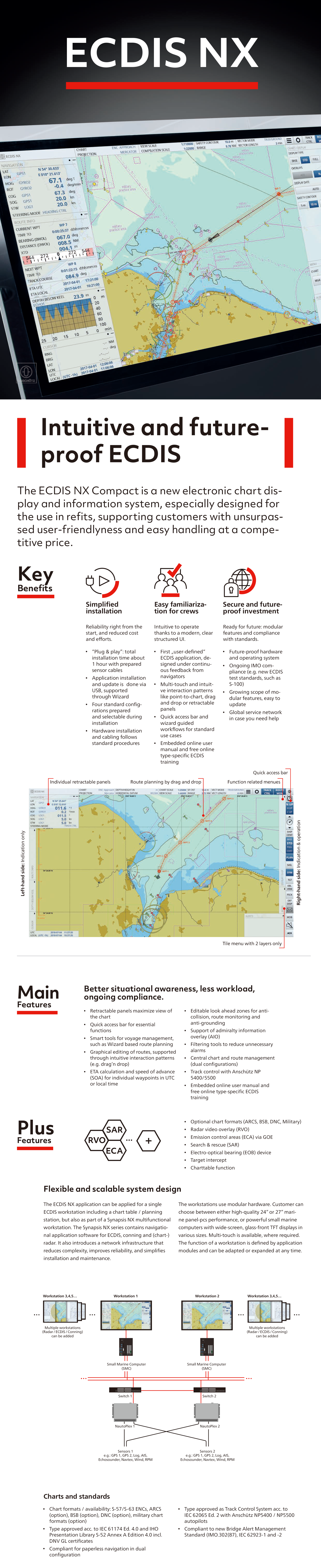 性能亮點: Advanced functions (known from “INS”) significantly contribute to safe navigation and efficient watchkeeping; Modular features and compliance with standards; Smart tools for voyage management; Compliant for Paperless Navigation; Compliant to new Bridge Alert Management; Flexible and scalable system design